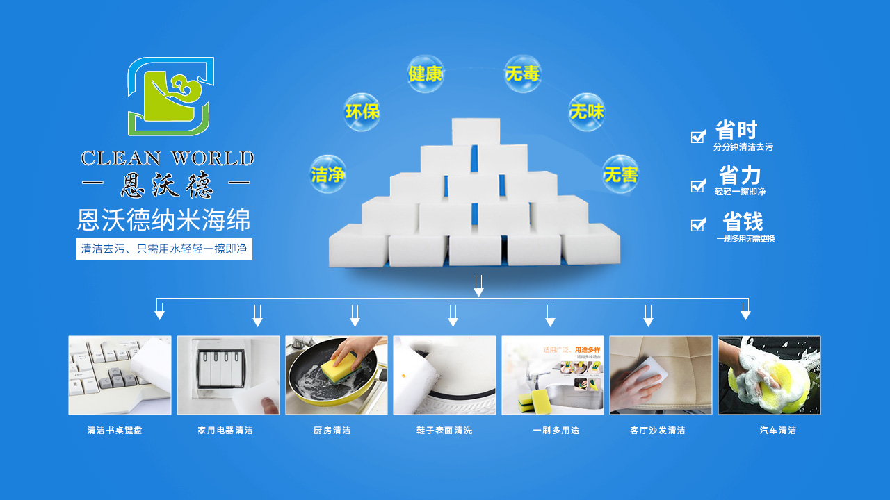 納米海綿是一種有高開孔率的三維網格結構的新型泡沫塑料,采用物理去污的機理,依靠納米海綿特殊三維網狀結構(每個小顆粒比頭發絲的萬分之一還?。⑵浣窈螅鋬炔烤蜁纬蔁o數個納米級毛細管開孔結構,在抹拭過程自動吸附物體表面的污漬。所以這些海綿塊只需要加一點水,就變成清潔力強的產品,可以擦拭頑固的污漬,也不用擔心會有刺激性化學物質。納米海綿可以用于家中的大多數物品的表面,從油煙機到灶臺、墻壁上的畫畫印記、浴室里的水漬水垢、浴缸污垢、茶杯里的茶漬、墻壁劃痕等通常難以擦洗的表面。